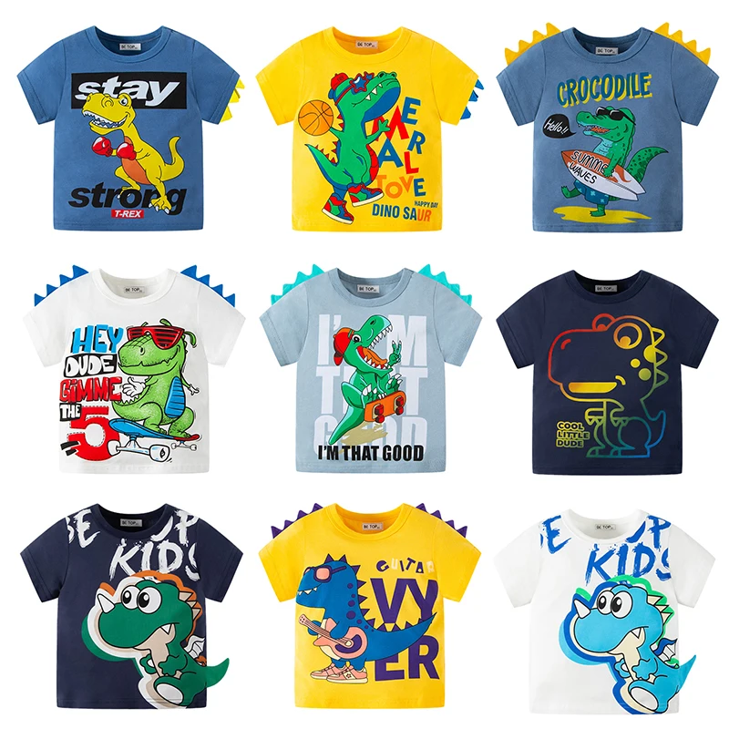This boys dinosaur cotton tee is a fun and comfortable summer essential for toddlers and kids. Made from soft, breathable cotton, it helps keep little ones cool during warm weather. The short sleeve design allows easy movement for active play. Featuring a cute cartoon dinosaur print, it adds a playful and adventurous touch. The lightweight fabric feels gentle on sensitive skin. Its classic round neckline makes it easy to put on and take off. Designed for boys ages 2 to 8 years, it offers a relaxed and comfortable fit. The durable stitching stands up well to everyday wear and washing. This tee pairs perfectly with shorts, jeans, or joggers. It is ideal for casual outings, school, or playtime at home. The bright design keeps kids excited to wear it. This dinosaur tee is a must-have addition to any child’s summer wardrobe.
