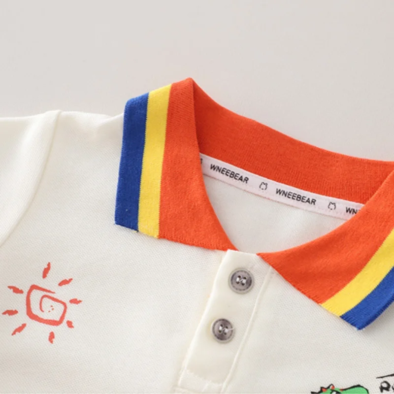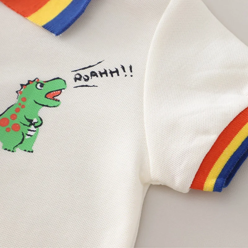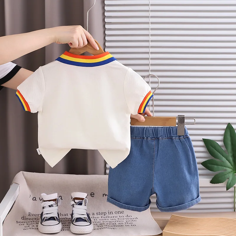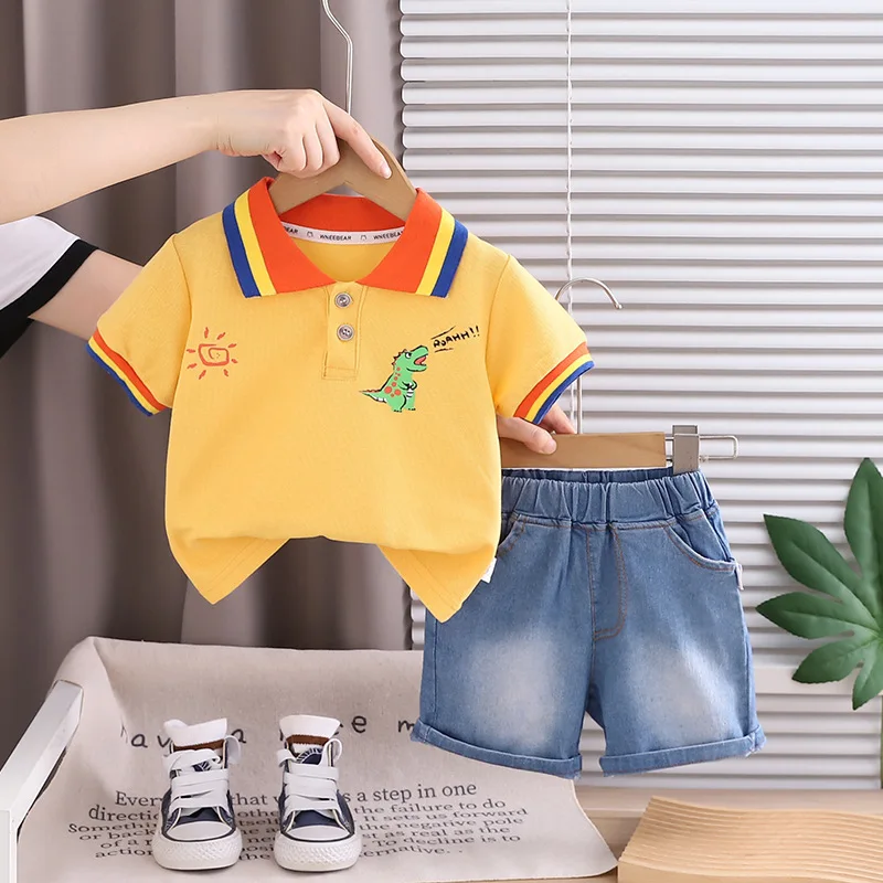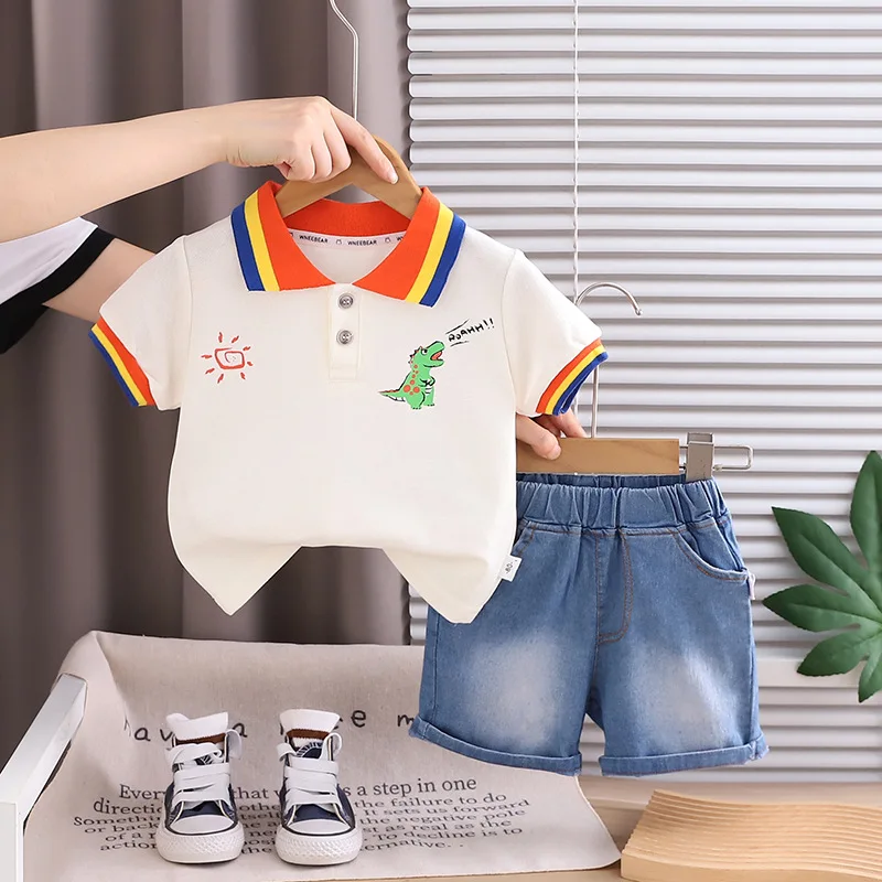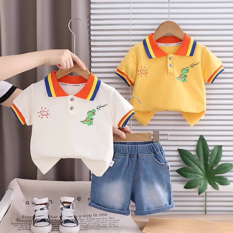 This boys summer outfit combines comfort and playful style for everyday wear. The set includes a short sleeve polo T-shirt paired with classic denim shorts. Made from soft cotton fabric to keep kids cool and comfortable in warm weather. The fun dinosaur and sun print adds a cute and trendy touch children love. Designed in a casual style that looks modern and neat. Lightweight materials allow easy movement for active toddlers and young boys. The polo shirt offers a smart look while remaining breathable and soft. Denim shorts provide durability and a relaxed fit for daily play. Easy to put on and take off, making dressing simple for parents. Suitable for outings, playdates, vacations, or casual family events. Durable stitching holds up well to frequent washing and wear. A stylish, practical, and fun summer outfit for boys aged 1–5 years.