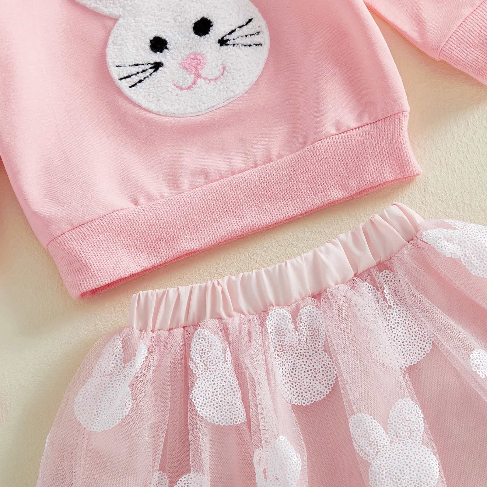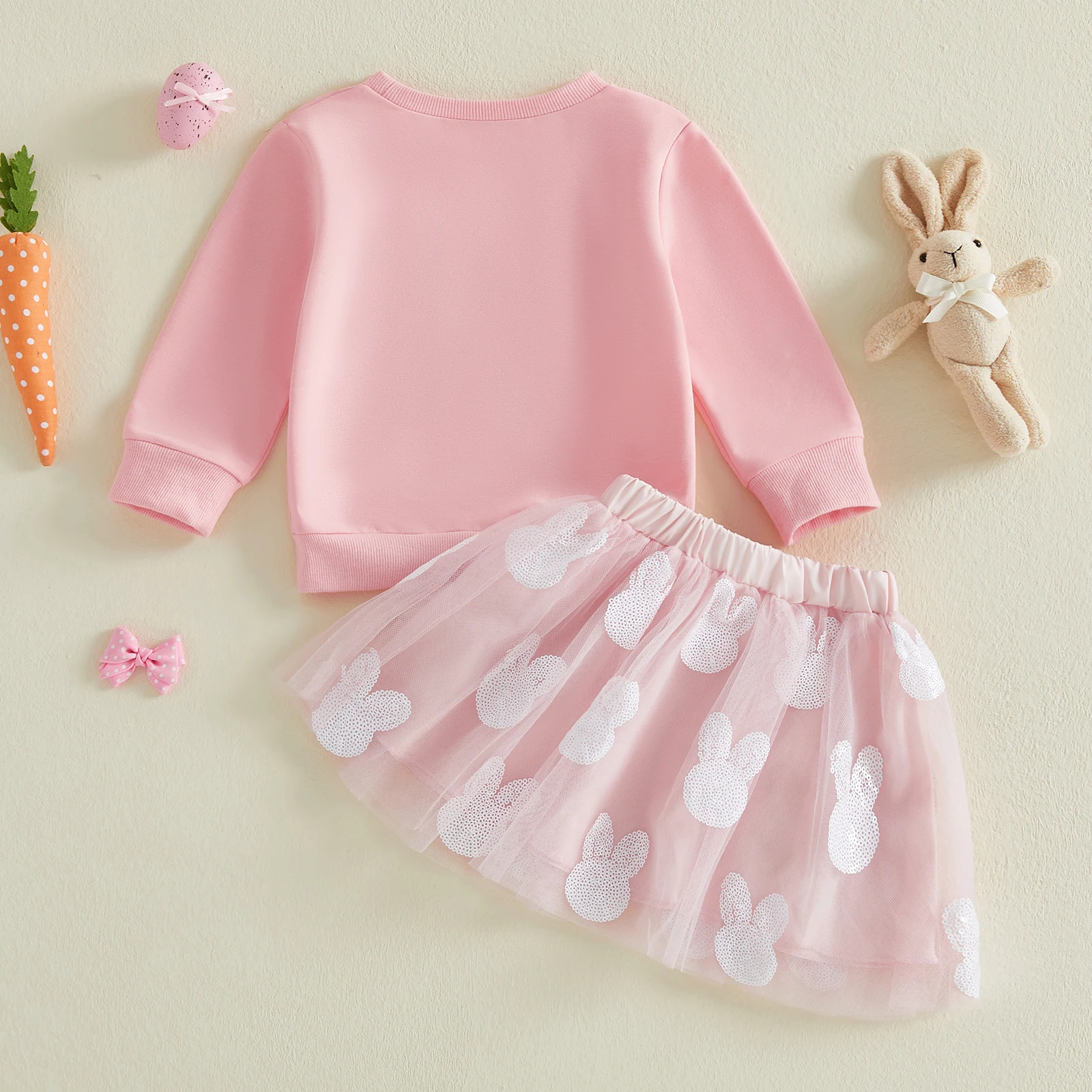 This adorable Easter outfit for toddler girls is perfect for spring celebrations. The set includes a long sleeve sweatshirt and a matching tulle skirt. The sweatshirt features sweet bunny embroidery for a festive touch. The soft fabric keeps your little one warm and comfortable on cooler spring days. The layered tulle skirt adds a playful and dressy look. It creates a beautiful silhouette that is perfect for Easter photos. The elastic waistband ensures a secure and comfortable fit. This outfit is ideal for Easter parties, church events, and family gatherings. The breathable material allows easy movement for active toddlers. The charming design blends comfort and style effortlessly. Pair it with cute flats or sandals for a complete look. This two piece set is a delightful addition to your little girl’s seasonal wardrobe.