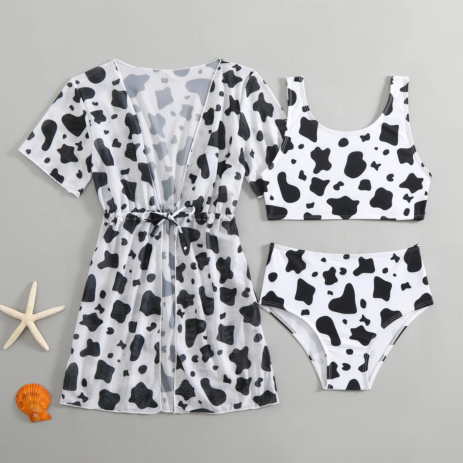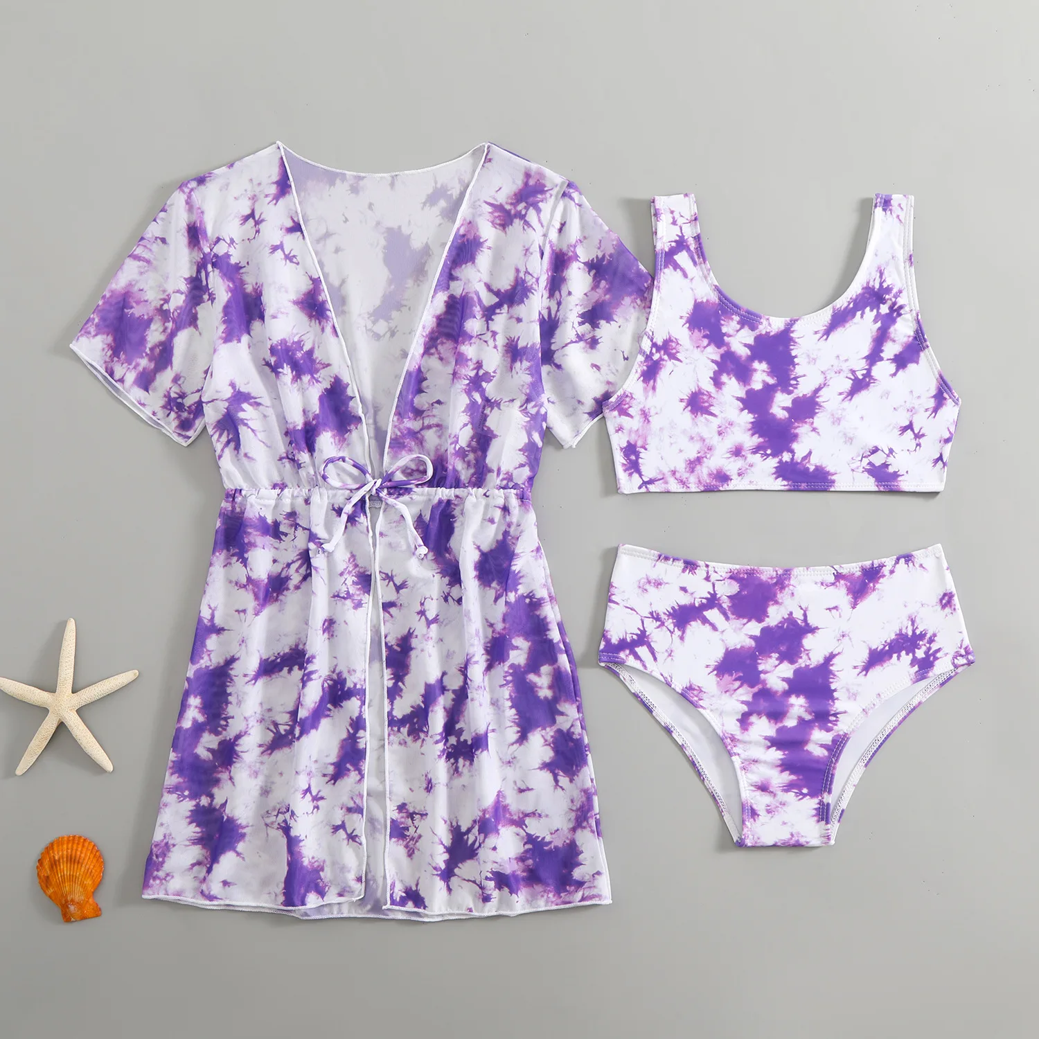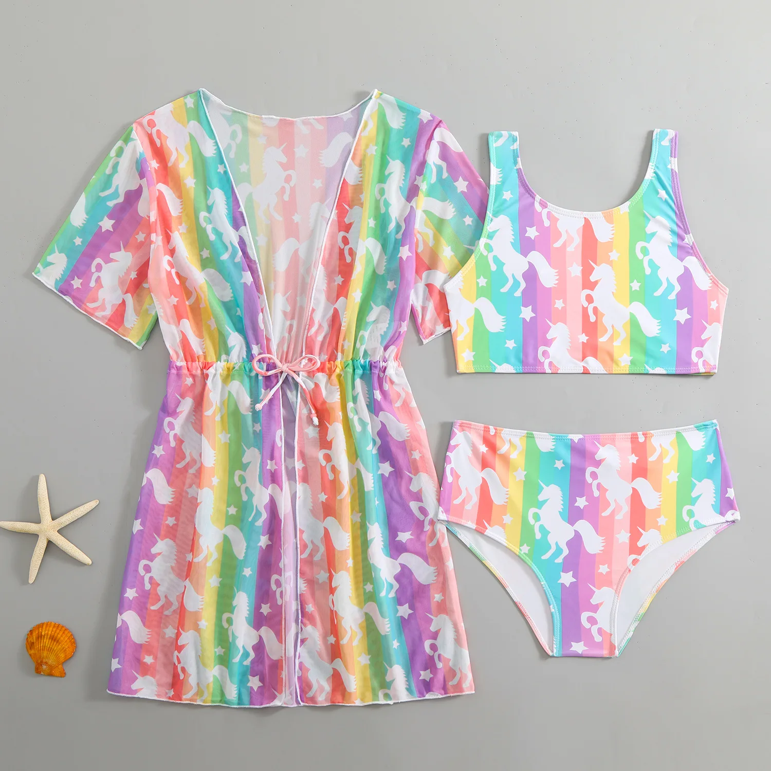 Stylish 3-piece girls swimsuit set featuring a tropical print bikini with a matching drawstring, quick-dry cover-up. Perfect for beach days, pool parties, and summer vacations for girls ages 6–12.
