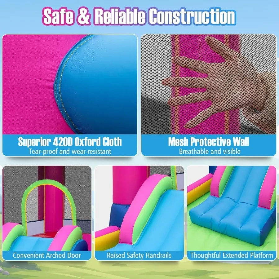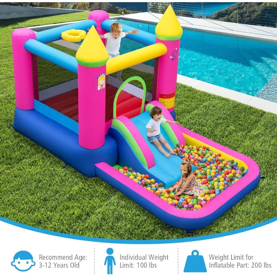 Create magical playtime fun with this princess-themed inflatable bounce house for kids. Designed with a spacious jumping area, it lets children bounce safely and freely. The built-in slide adds extra excitement and active play. A basketball hoop and ball pit provide multiple ways to play and stay engaged. Perfect for indoor and outdoor use, making it ideal for year-round fun. Made from durable materials that support energetic jumping and sliding. Bright princess-themed colors inspire imagination and role-playing. Easy to inflate and deflate, saving time for parents during setup. Lightweight and portable for backyard parties or family gatherings. Encourages physical activity, balance, and coordination in young children. Great for birthdays, playdates, or holiday celebrations. A fun, versatile, and engaging inflatable playhouse that turns any space into a joyful play zone for kids.